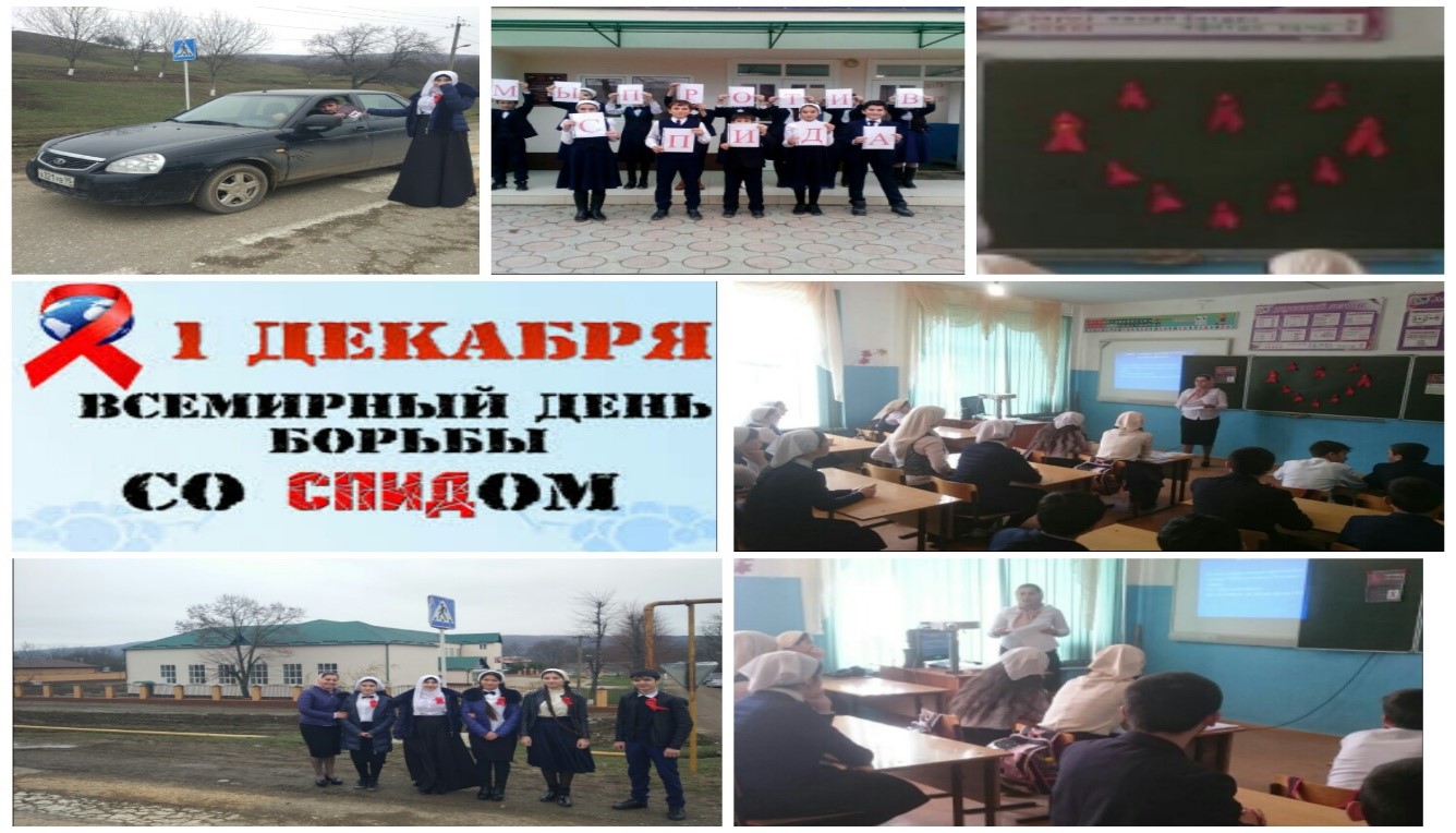 Акция «СТОП ВИЧ/СПИД» раздача листовок населению -11 класс; Беседа на тему «1 декабря – Всемерный День борьбы со СПИДом» -9-11 классы; Классные часы «Выбери будущее без СПИДа!» - 7-11 классах; Флешмоб «Мы против СПИДа».